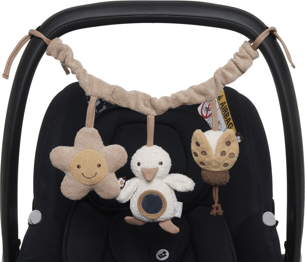 Vind je het ook zo heerlijk om een wandeling te maken met je kleintje? Om voor vermaak te zorgen van je baby tijdens jullie ommetje, is een wagenspanner ideaal. Bovendien ziet dit er ook nog een super schattig uit en stimuleert het de ontwikkeling! De wagenspanner heeft 3 leuke knuffeltjes: een bloemetje, een eendje en een lieveheersbeestje. Alle knuffeltjes hebben een knisperelement. Het eendje heeft daarnaast nog een spiegel op zijn buikje. Het bijtje heeft een zacht belletje. Dit zal zorgen voor urenlang vermaak! Je kunt de wagenspanner gemakkelijk aan de kinderwagen of Maxi Cosi bevestigen. Ben je op zoek naar een enkele hanger? Bekijk dan ook de schattige wagenhanger Duck van Jollein.
